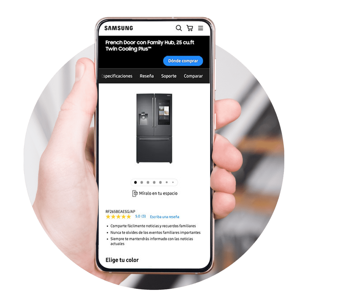Utilizando las pautas de marca de Samsung, creamos call-to-actions personalizados que encajaban perfectamente con su plataforma de comercio electrónico. Luego utilizamos un equipo de especialistas en 3D para crear más de 200 productos 3D que podían dimensionarse y renderizarse según las dimensiones reales de los productos.